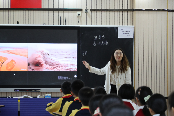 活动分为教学观摩、集中研讨与专家点评三个环节。首先,王煦彦执教六年级古诗《浪淘沙》。课堂上,人工智能不再是冰冷的工具,而是化身为引渡学生神思的舟楫。教师引导学生在朗读、品析与想象中完成审美体验的建构,生动诠释了从“诗心”到“画意”的审美历程,为现场及线上观摩教师呈现了一节诗意与技术交融的示范课。